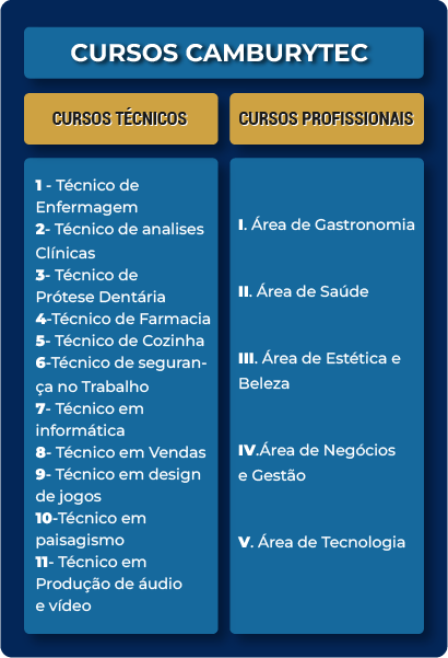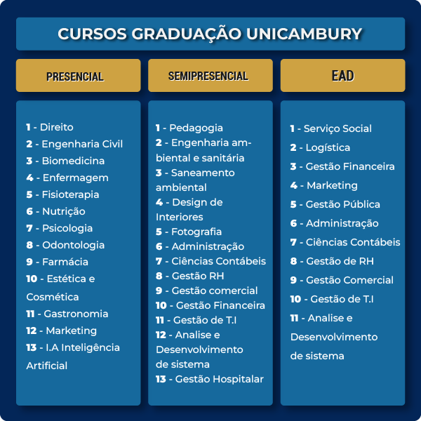 Na UniCambury, cada curso tem uma profissão por ano, e estas são a base do aprendizado prático. Esse modelo possibilita aos alunos a obtenção de um certificado anual por profissão cursada, além do diploma de conclusão de curso.